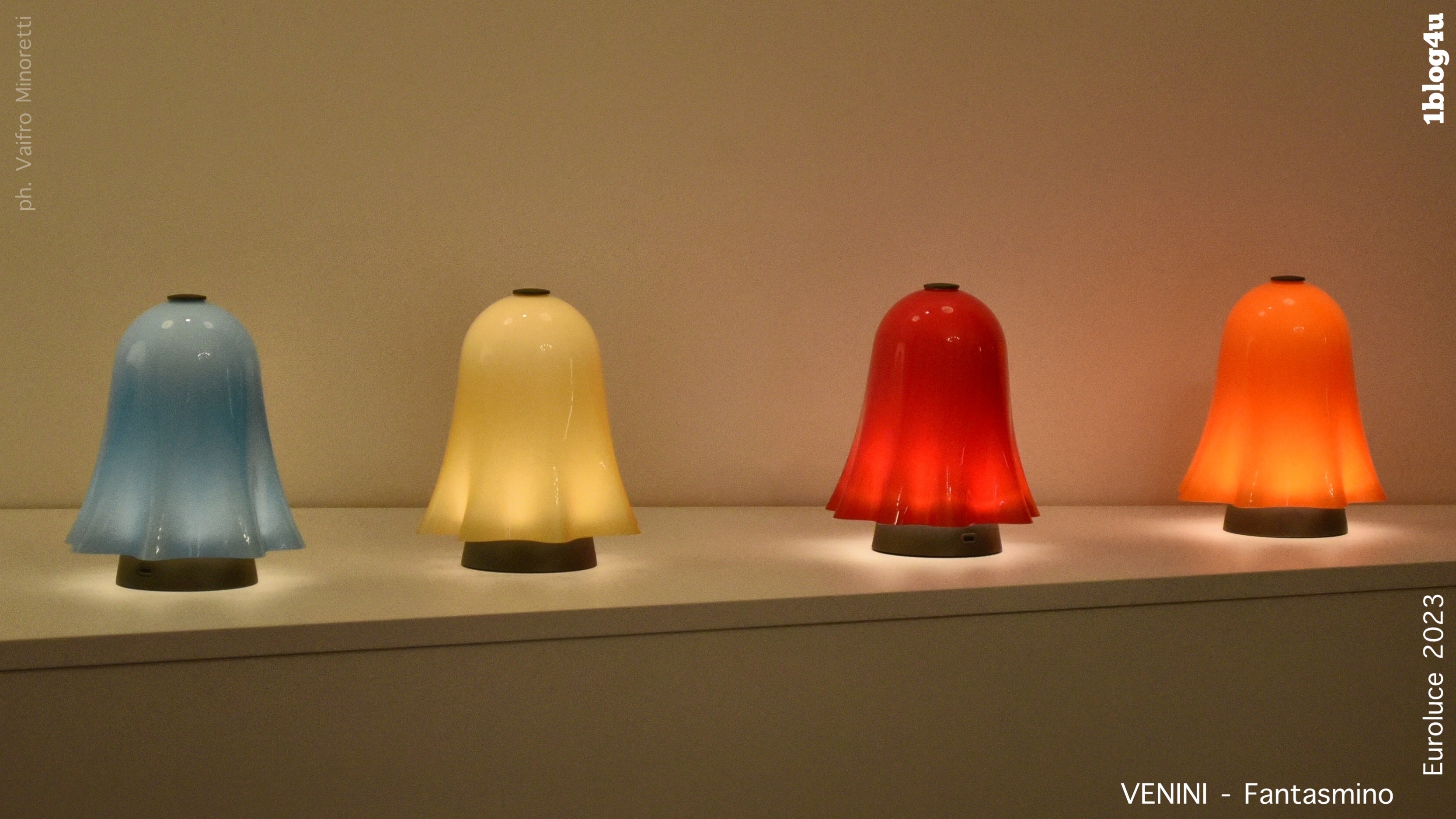 “Fantasmino is a table lamp made of opal blown glass obtained by overlapping the milky glass with other glass, the opal glass is blown and handmade. The structure is made of burnished metal.