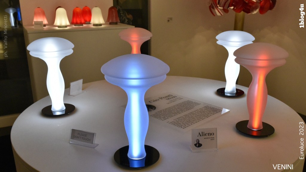 “A luminous object with a sinuous and fun appeal designed by Studio Marco Piva, a small alien that illuminates table centerpieces, consoles, shelves and bedsides tables. “Alieno” is a lamp with translucent coloured finish available in a variety of chromatic shades” (Venini)