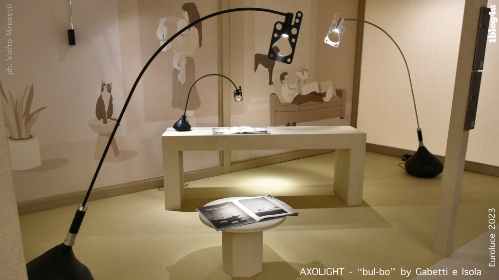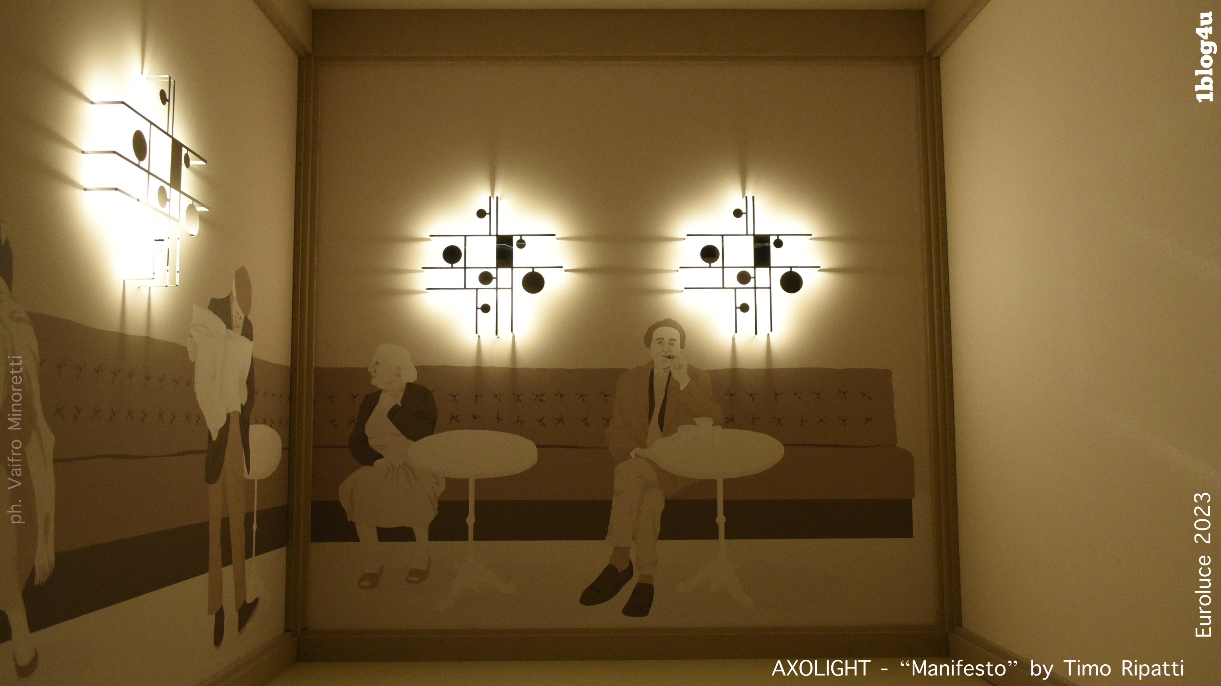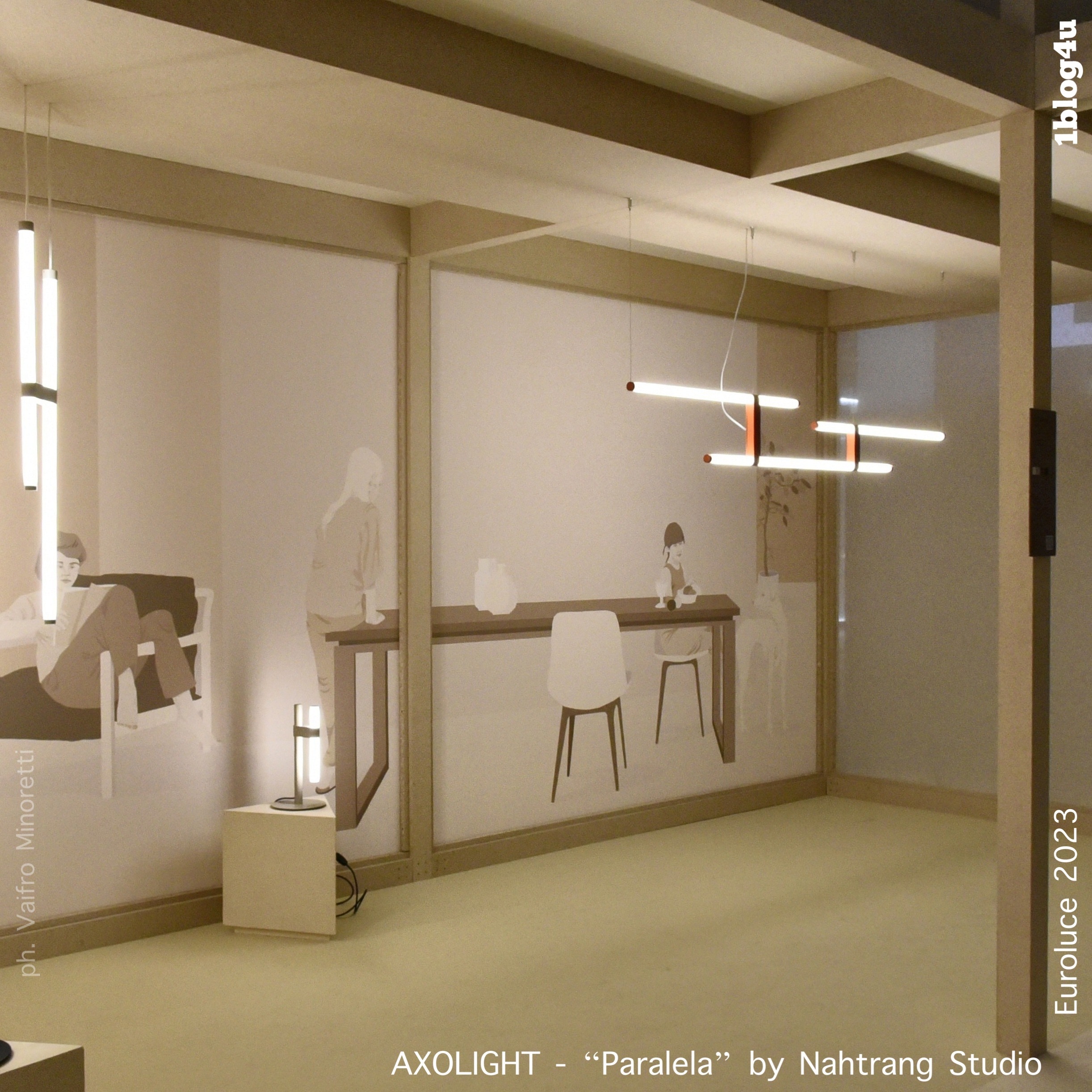 Another brand visited at Euroluce 2023, we were very impressed by the structure of the stand (made by Studio Milo) and by the original illustrations on the walls (made by Marta Lonardi), depicting scenes of common life and that well highlighted the production of Axolight.